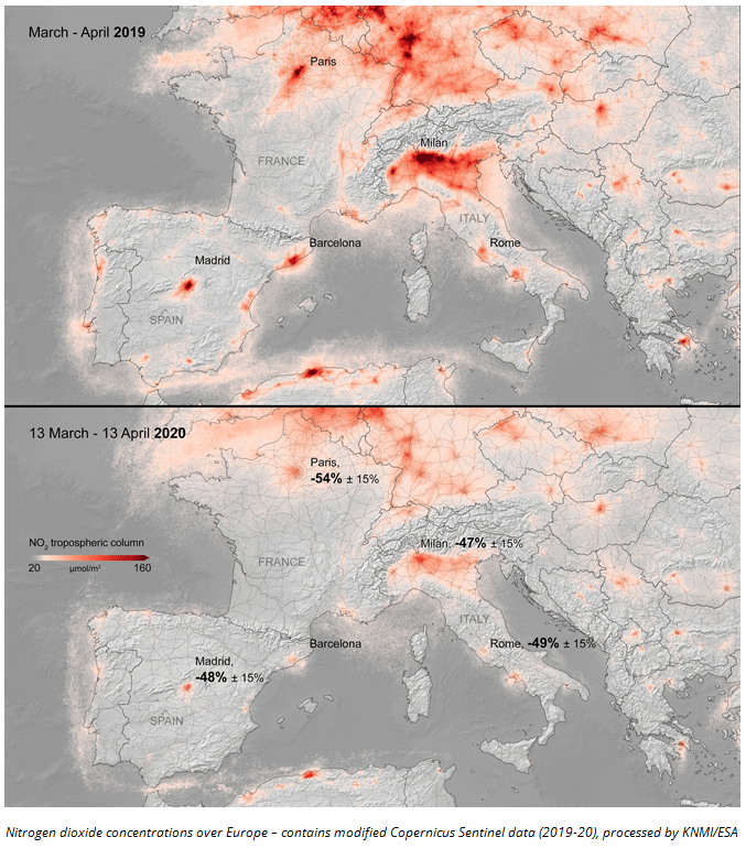 Scientists from the Royal Netherlands Meteorological Institute (KNMI) have been monitoring air pollution over Europe in the past several months using data from the Tropomi instrument from the Copernicus Sentinel-5P satellite. The new images show the nitrogen dioxide concentrations from 13 March until 13 April 2020, compared to the March-April averaged concentrations from 2019. Madrid, Milan and Rome saw decreases of around 45%, while Paris saw a dramatic drop of 54% – coinciding with the strict quarantine measures implemented across Europe.